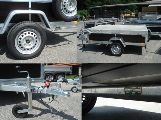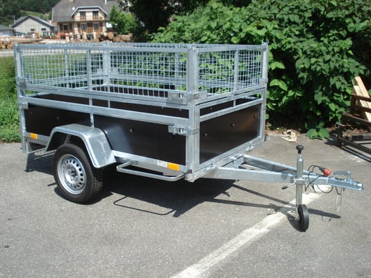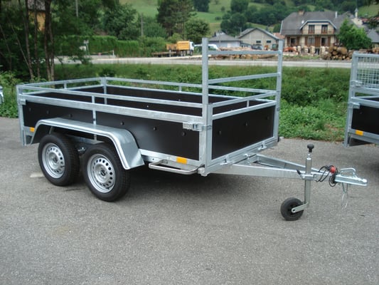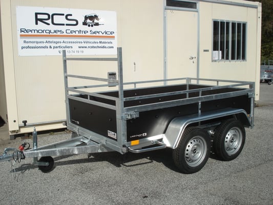 Essieu ALKO 750kg équipé de suspensions à barre de torsion caoutchouc avec roulements etanches,2 pare cycliste, 4 feux reflechissants, pneus 155/70/13, 2 feux de gabarit, Ridelles avant et arrière rabattables fermeture par grenouillères équipées de poignée avec cliquet de sécurité, rampe de feux faisant partie intégrante du châssis renforcée par profilé et encastrée permettant le stockage vertical. Feux intégrés dans la rampe ce qui assure une bonne protection contre les chocs. Main courante sur tout le cadre , 4 crochets de fixation aux extremités du plancher.