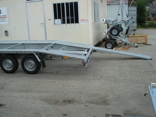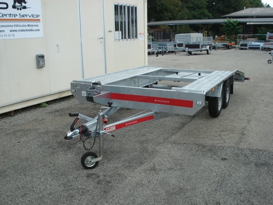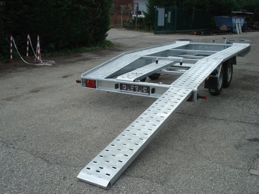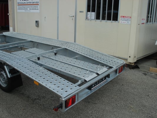 plateau porte voiture avec pan arriere incliné et 2 rampes de 2 metres pour minimiser la pente d'acces pour vehicules bas