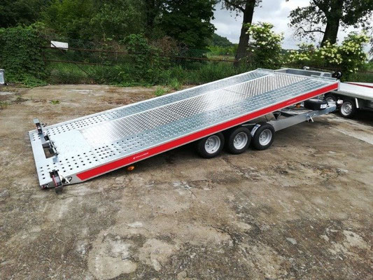 plateau a trous type LOHR pour une tres bonne adherence et surtout une precison d'ajustement des cales permettant également le blocage des roues du véhicule transporté avec les sangles 3 POINTS