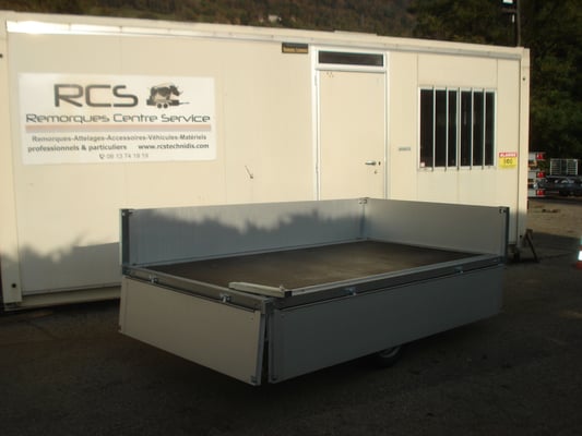 plateau timon en V , roue jockey, ridelles alluminium amovibles avec joints d’etanchéité ,6 crochets d’arrimage sur profilés interieur convexes lateraux, pour eviter les accrocs au chargement ,2 pare boue bavettes.