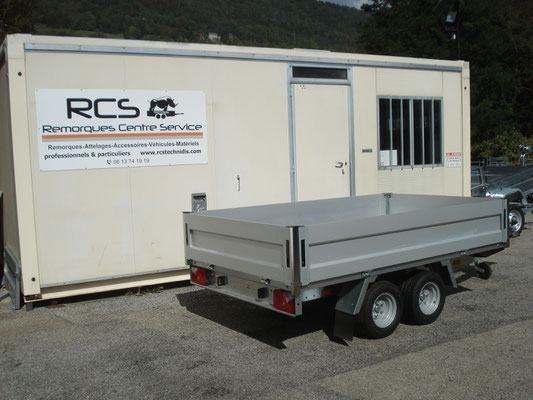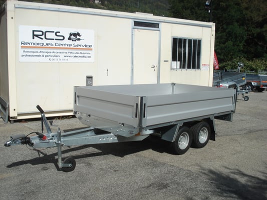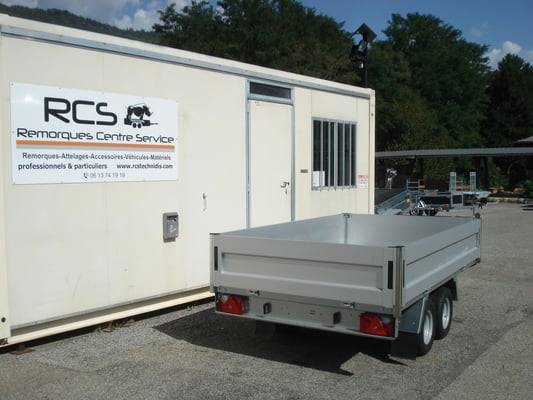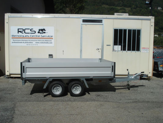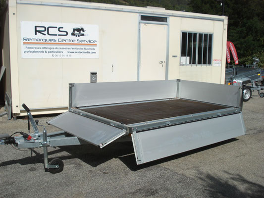 plateau timon en V , roue jockey, ridelles alluminium amovibles avec joints d’etanchéité ,6 crochets d’arrimage sur profilés interieur convexes lateraux, pour eviter les accrocs au chargement ,2 pare boue bavettes.