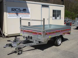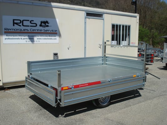 plateau timon en V , roue jockey, ridelles amovibles plancher galva chargement 1 Essieux freiné 1500 kg freiné , pneus 195 50 13