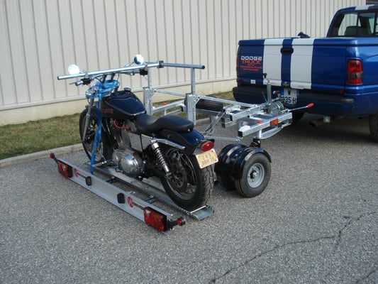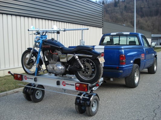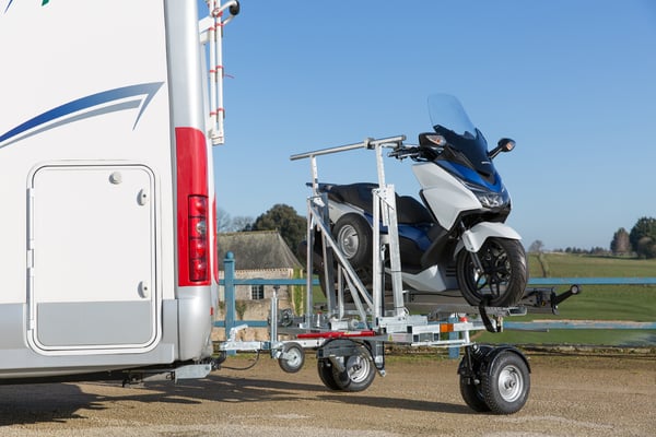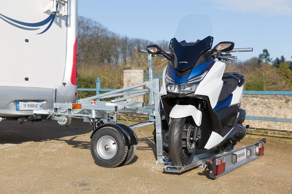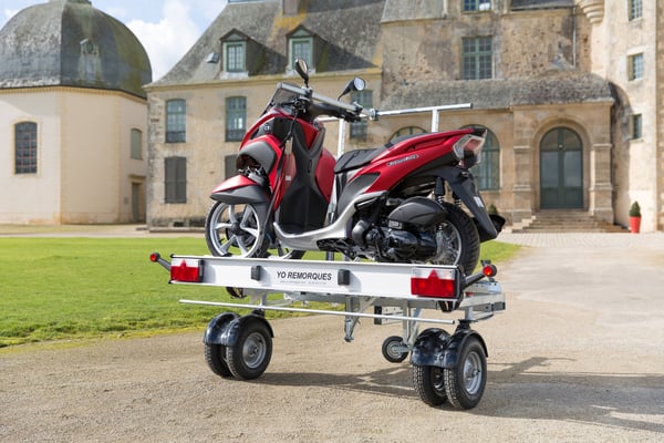 la remorque IDEALE Pour CAMPING CAR DIMENSIONS REDUITES et facilité de chargement au sol grace au systeme YO, pour le transport de votre scooter, moto, ou mp3.